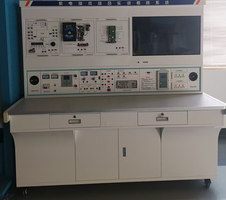 7、 該系統每個操作臺都設有獨立元件柜,便于對元件的保管和安裝施工,有利于教學的安裝培訓和使用方便。通過模擬廚房的立體形式來展示各種小家電的實訓模塊,方便學生更加直觀的去學習,可以根據學校的實際教學條件分組完成各種小家電的實訓內容。