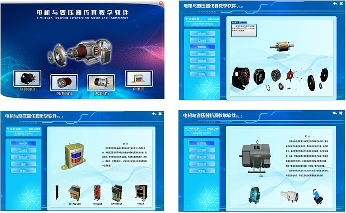 電機與變壓器仿真教學(xué)軟件依據(jù)《職業(yè)院校數(shù)字校園建設(shè)規(guī)范》(教職成函[2015]1 號)與教育部頒布的有關(guān)專業(yè)教學(xué)大綱而設(shè)計,選取典型的電機與變壓器,圍繞其核心知識點和技能點展開,兼顧教師的課堂教學(xué),力爭達到軟件的職業(yè)性、情境性、過程性、交互性的相互交融。