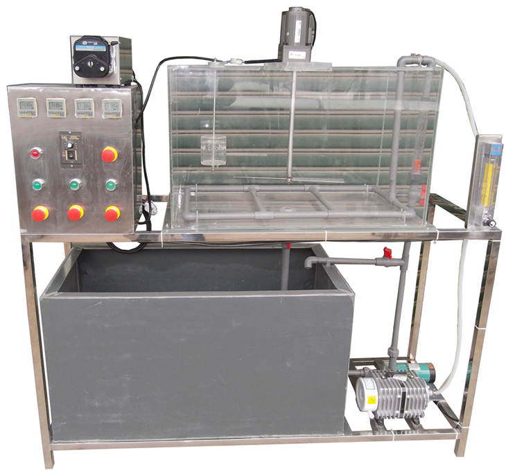 反應(yīng)池、曝氣頭、抽吸泵、氣泵、水泵、流量計(jì)、配水箱、穿孔曝氣器、不銹鋼可移動框架、控制屏。