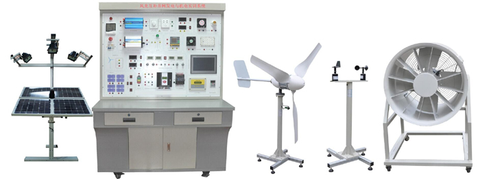 系統裝置由太陽能光伏電板、雙軸跟蹤控制模塊、蓄電池模塊、太陽能控制器模塊、太陽能逆變器模塊、模擬風洞發電模塊、開關控制模塊、環境監測模塊、上位機監控模塊,儀表顯示部分,(各功能轉換接口模塊)等組成;各控制系統集成于風能發電、光伏發電為一體的教學實訓臺;各系統通過連接電纜進行連接,形成一套可完成風力及光伏發電、同步并網、離網電源的實驗及教學演示。幫助學生理解太陽能并網、離網及風力發電系統的原理,從而起到學習工程實際應用技能的作用。