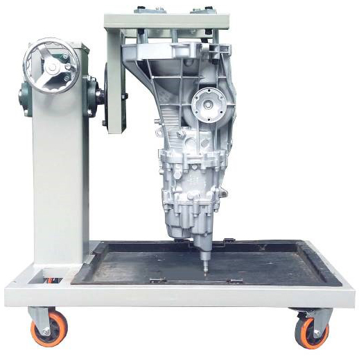 采用減速翻轉(zhuǎn)機(jī)構(gòu),可使變速器旋轉(zhuǎn)任意角度,并能任意位置鎖止,便于學(xué)生從不同的角度進(jìn)行拆卸和裝配。