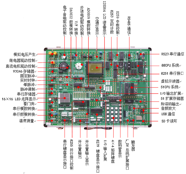 含箱體、電源、51單片機(jī)系統(tǒng)和微機(jī)接口8088系統(tǒng)以及標(biāo)配實(shí)驗(yàn)電路 |