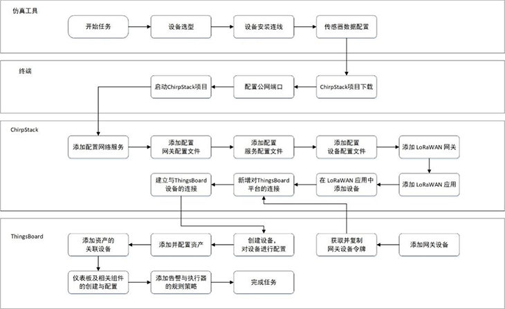 模擬智慧牧場(chǎng)系統(tǒng)還引入使用開(kāi)源軟件平臺(tái)ChirpStack與ThingsBoard,結(jié)合LPWAN技術(shù),實(shí)現(xiàn)遠(yuǎn)程低功耗數(shù)據(jù)采集、上報(bào)和展示。在ChirpStack平臺(tái)上,用戶可對(duì)網(wǎng)關(guān)、GPS、溫濕度傳感器等設(shè)備進(jìn)行配置,以上送仿真實(shí)驗(yàn)中的虛擬數(shù)據(jù)。在ThingsBoard平臺(tái)上,設(shè)置牧場(chǎng)地圖、告警信息、溫濕度等各儀表盤(pán)組件;獲取仿真設(shè)備上送的數(shù)據(jù),并將數(shù)據(jù)以圖表形式作可視化呈現(xiàn);以及基于流式編程添加相應(yīng)的規(guī)則策略,最終完成模擬智慧牧場(chǎng)實(shí)訓(xùn)場(chǎng)景的部署搭建。