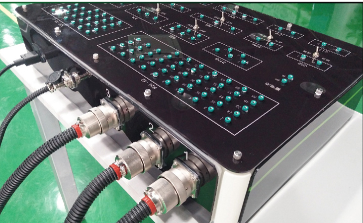 4、機械故障設置終端通過更換面板上不同功能的插件和短路跨接線實現斷路、線路虛接、對地短路、對正極短路故障設置,在機械故障設置終端不變的情況下更換不同的連接線束和檢測面板可實現不同系統的實訓操作;