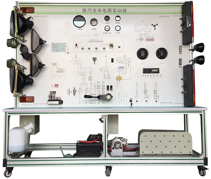 全車電器電路實訓設備采用陜汽SX2220柴油機整車電器實物為基礎,充分展示汽車儀表系統、燈光系統、雨刮系統、喇叭系統、發動機電器系統、起動系統和充電系統等汽車電器各系統的組成結構和工作過程。