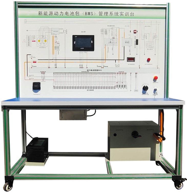 磷酸鐵鋰動力電池包與鐵制電池箱(單體電池3.2V 20AH,24串)、BMS鋰電管理一體機、動力電池包觸摸顯示屏、車載充電機、國標充電插口、國標充電槍、緊急斷電開關、霍爾電流傳感器、直流接觸器(包含充電繼電器、總正繼電器、總負繼電器、預充繼電器)、DC-DC轉換器(72V-12V30A)、輔助蓄電池(12V45AH)、放電控制繼電器與放電負載電阻、預充電阻器、可移動實訓臺(1500×700×1700mm 帶自鎖腳輪裝置,帶安裝檢測端子的原理面板,面板1448×940mm)、故障模擬與排除裝置、設備操作說明書。
